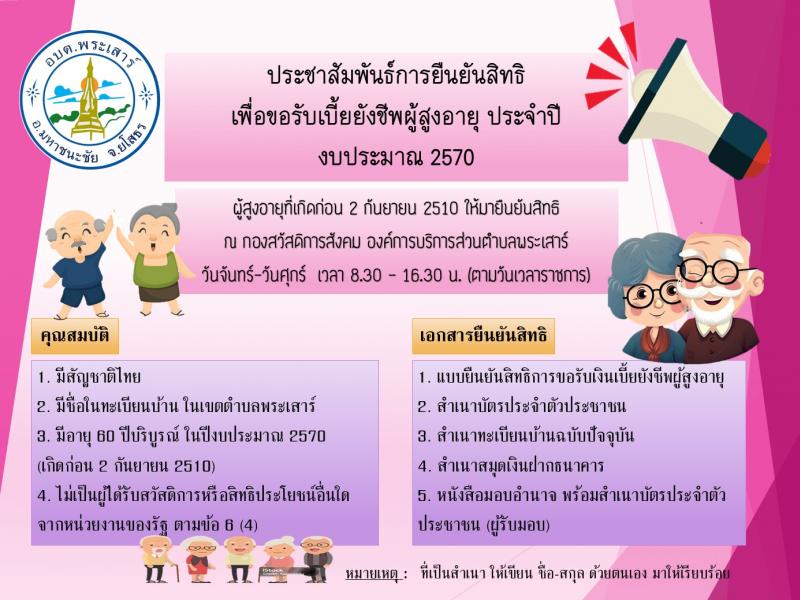 ประชาสัมพันธ์ การยืนยันสิทธิรับเบี้ยยังชีพผู้สูงอายุ ประจำปีงบประมาณ พ.ศ. 2570