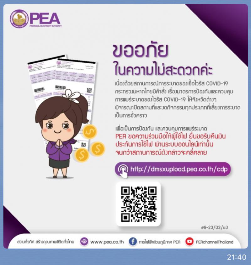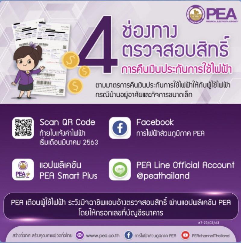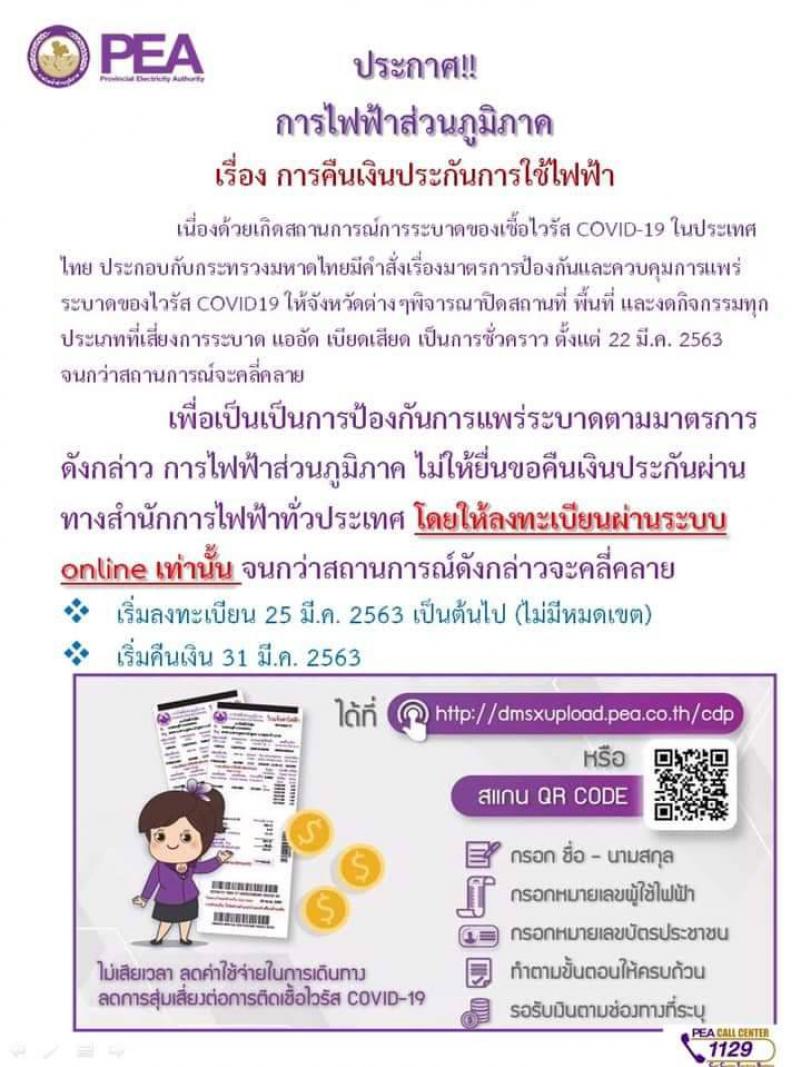 การคืนเงินประกันการใช้ไฟฟ้า สามารถลงทะเบียนทาง website ได้ตั้งแต่วันที่ 25 มีนาคม 2563 เป็นต้นไป (ไม่มีกำหนดเวลาสิ้นสุด)