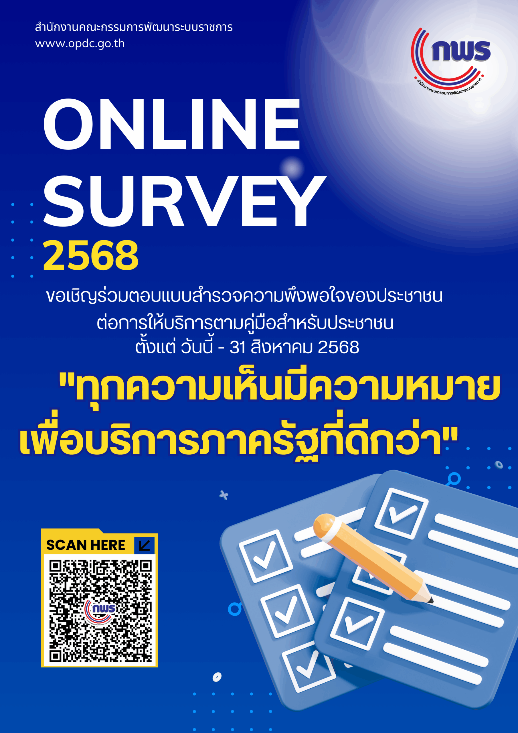สำนักงาน ก.พ.ร. ขอเชิญร่วมตอบแบบสำรวจความพึงพอใจของประชาชนต่อการให้บริการของหน่วยงานของรัฐ ปี พ.ศ. 2568 เพื่อประโยชน์ในการพัฒนาบริการภาครัฐและอำนวยความสะดวกแก่ประชาชน โดยสามารถแสดงความเห็นได้ตั้งแต่วันนี้จนถึง... [7 สิงหาคม 2568]