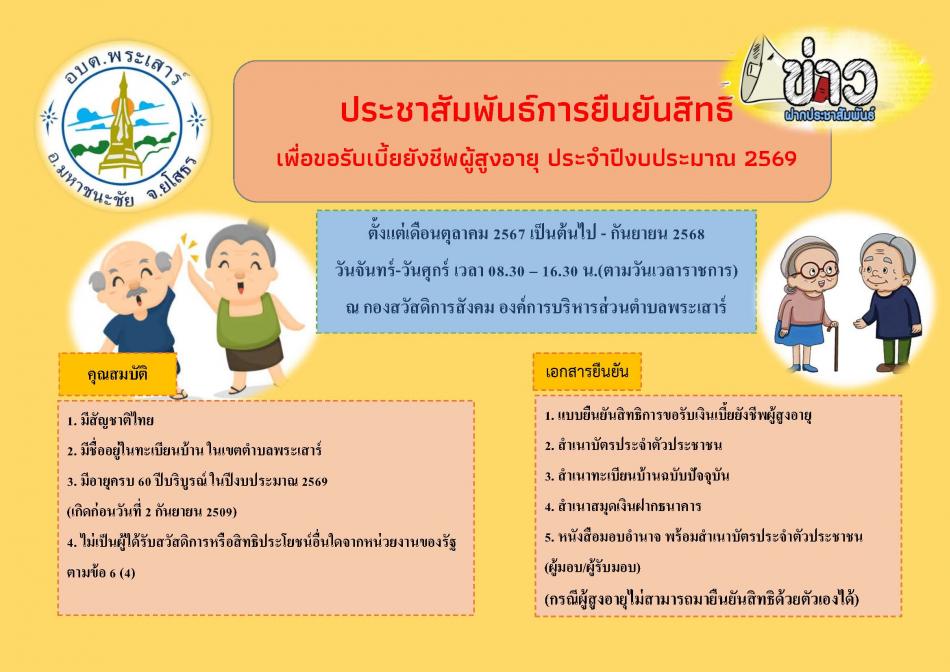 การยืนยันสิทธิเพื่อขอรับเบี้ยยังชีพผู้สูงอายุ ประจำปีงบประมาณ 2569 [1 ตุลาคม 2567]