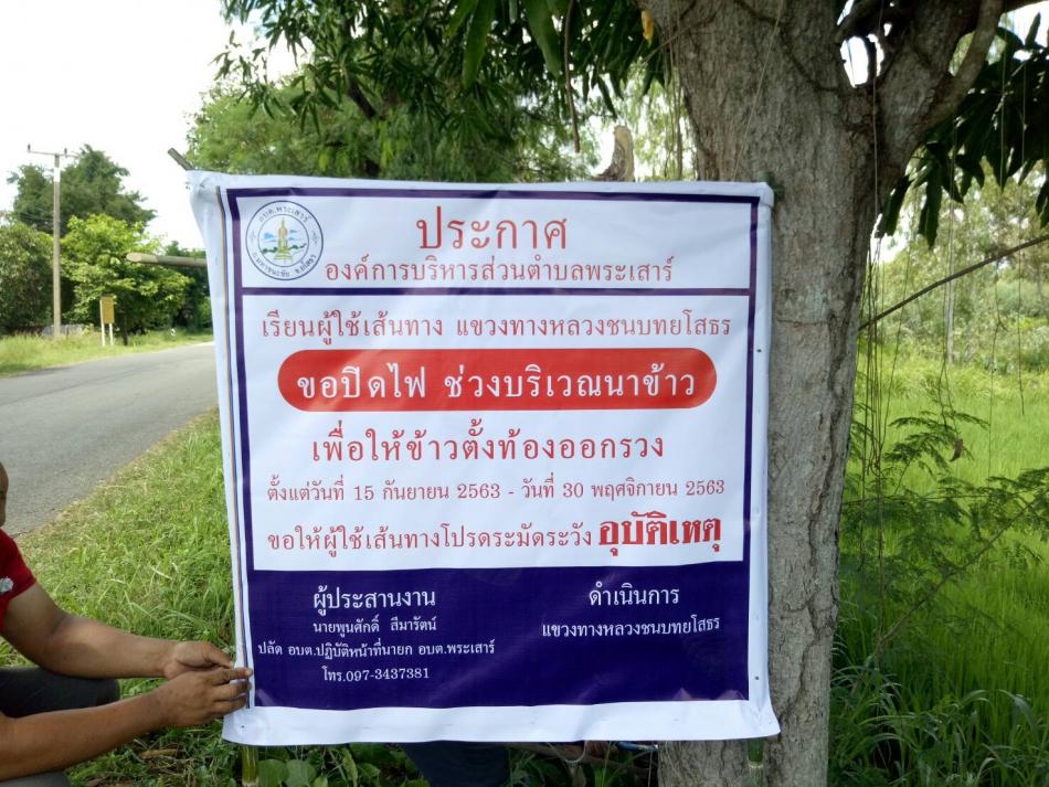 แจ้งขอปิดไฟช่วงบริเวณนาข้าว ถนนสายหนองตุ-นาโพธิ์ ช่วงบ้านโนนยาง-บ้านปลาปึ่ง เพื่อให้ข้าวตั้งท้องออกรวง ตั้งแต่วันที่ 15 กันยายน 2563-วันที่ 30 พฤศจิกายน 2563 ขอให้ผู้ใช้เส้นทางโปรดระมัดระวังอุบัติเหตุ